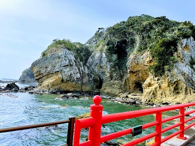 弁天島は、崩れやすい砂岩層から成り、高さ17m前後の島状ですが、干潮時には地続きとなるようです。